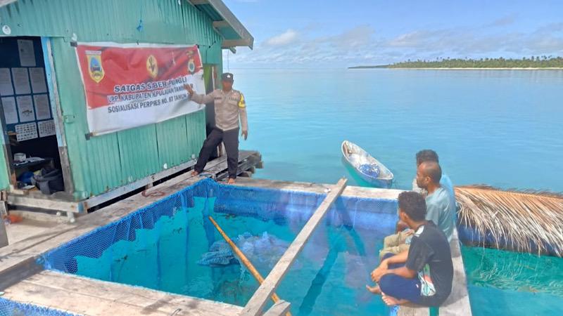 Pemandangan yang tak biasa diperlihatkan oleh Bhabinkamtibmas Bripka BRIAN CHRISTOFFEL dalam memberikan materi sosialisasi tentang Saber Pungli kepada para Nelayan Ikan Kerapuh yang berlokasi di tengah lautan tepatnya diatas Keramba pada Perairan Pulau Matakus, Sabtu (20/04/24).