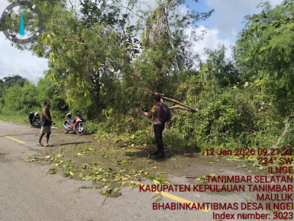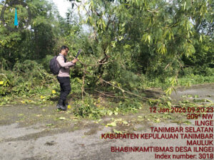 Tribratanews.polrestanimbar.com – Polda Maluku, Kepolisian Resor Kepulauan Tanimbar, Aksi sigap ditunjukkan oleh Bhabinkamtibmas Desa Ilngei, Bripka BADIR, dalam menanggapi laporan Warga terkait adanya pohon tumbang yang menutupi akses jalan poros Desa Ilngei, tepatnya di wilayah RT 10/RW 02, Kecamatan Tanimbar Selatan, Kabupaten Kepulauan Tanimbar, pada Senin (12/01/26).
