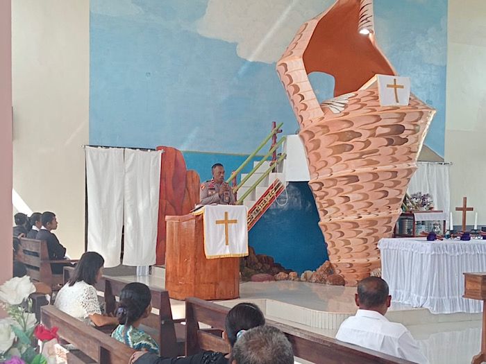 Tribratanews.polrestanimbar.com – Polda Maluku, Kepolisian Resor Kepulauan Tanimbar, Wujudkan kepedulian antar Umat Beragama, Kapolsek Wuarlabobar Ipda LEOPOLDUS P. WARAWARIN pimpin giat Minggu Kasih bersama para Jemaat GPM Wunlah, Kecamatan Wuarlabobar, Kabupaten Kepulauan Tanimbar, Minggu (12/05/24).