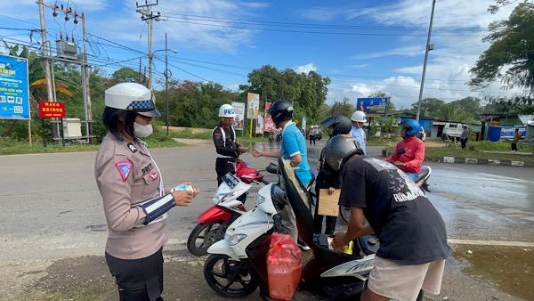 “Sebanyak 3 (tiga) pengendara ditilang, 10 (sepuluh) pengendara diberi teguran hingga membagikan stiker dan brosur kepada para Pengendara yang diperiksa” ungkapnya.