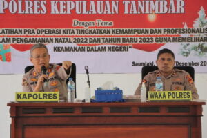 tribratanews.polrestanimbar.com – Polda Maluku, Polres Kepulauan Tanimbar, Dalam rangka Pengamanan Natal 2022 dan Tahun Baru 2023, Kapolres Kepulauan Tanimbar, AKBP Umar Wijaya, S. I. K didampingi Wakapolres Kepulauan Tanimbar, Kompol Hendrik Rumsory, S. Sos memimpin pelaksanaan Giat Tactical Floor Game (TFG) di Gedung Bhayangkara, Rabu (21/22).
