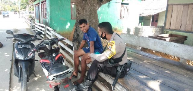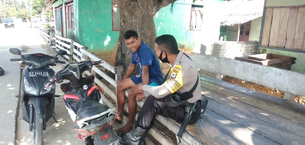 “Sodara tetap pakai masker biar terhindar dari bahaya penyebaran Covid-19”. Tutur Bhabinkamtibmas kepada pemuda yang dikunjungi.