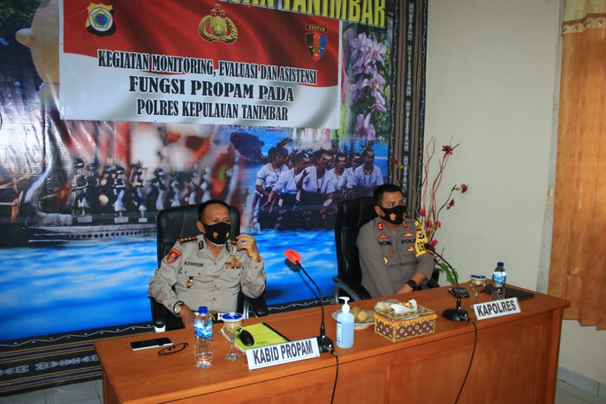Tribratanews.polrestanimbar.com – Polda Maluku, Polres Maluku Tenggara Barat, Rabu 02 Desember 2020, pukul 13.30 wit, bertempat di Ruangan Rapat/Vicon Polres Kepulauan Tanimbar dilaksanakan Kegiatan Monitoring, Evaluasi dan Asistensi Fungsi Propam Pada Polres Kepulauan Tanimbar oleh Kabid Propam Polda Maluku Kombes Pol. Muhammad Syarifudin dengan didampingi oleh Kapolres Kepulauan Tanimbar AKBP Romi Agusriansyah, S.I.K.
