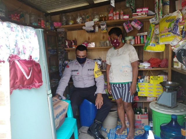 Bhabinkamtibmas Desa Ilngei Brigpol E. R. Tutupary mengunjungi Tempat Usaha/Kios milik Ibu Herlin Saikmat.