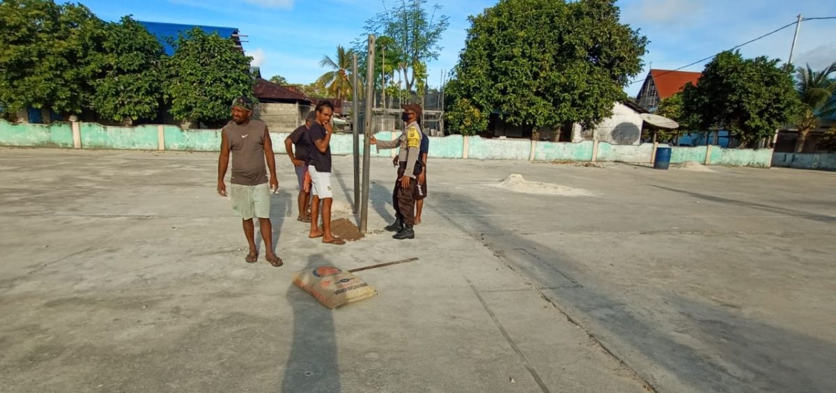 Bhabinkamtibmas Desa Kabiarat Brigpol B. Christofel menyambangi Warga yang sedang mengecor tiang net Volley di lapangan Volley Ball Desa.