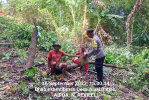 Tribratanews.polrestanimbar.com – Polda Maluku, Polres Kepulauan Tanimbar, Bhabinkamtibmas Desa Alusi Batjas Aipda N. Revileli sambangi Warga Binaan sekaligus mengawasi kegiatan pembersihan untuk pembukaan lahan yang bertempat di Dusun Fasmalai, Desa Alusi Batjas, Kecamatan Komomolin, Kabupaten Kepulauan Tanimbar, Sabtu (16/09).