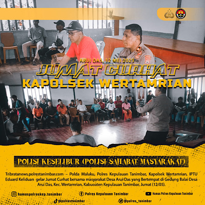 Tribratanews.polrestanimbar.com – Polda Maluku, Polres Kepulauan Tanimbar, Bertempat di balai Desa Arui das, Kecamatan Wertamrian, Kabupaten Kepulauan Tanimbar, Kapolsek Wertamrian Iptu Eduard Ris Keliduan pimpin giat Jumat Curhat Bersama Masyarakat Desa Arui Das, Jumat (12/05).