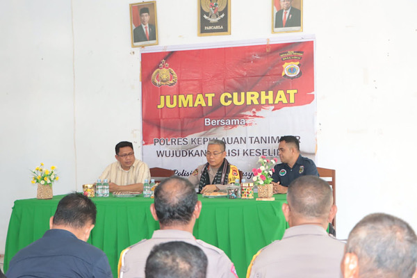 Sementara itu dalam sambutannya, Kapolres Kepulauan Tanimbar AKBP Umar Wijaya, S.I.K Menjelaskan bahwa Kegiatan Jumat Curhat yang dilaksanakan ini merupakan salah satu Program Kapolri yaitu Quick Wins Presisi Polri. Maksud dan tujuan dari pelaksanaan kegiatan Jumat Curhat ini adalah untuk menyerap permasalahan, informasi, mencari solusi terkait dengan permasalahan-permasalahan yang dihadapi oleh Masyarakat.