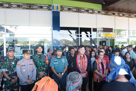 Setibanya di bandara, Bupati Kepulauan Tanimbar RICKY JAUWERISSA bersama Wakil Bupati dr. JULIANA CH. RATUANAK disambut dengan hangat oleh jajaran Forkopimda maupun Masyarakat dengan sangat antusias yang ditandai dengan prosesi adat hingga pengalungan syal tenun ikat Tanimbar.