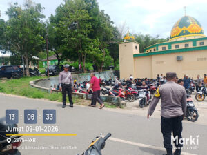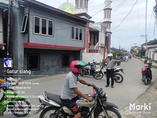 Tribratanews.polrestanimbar.com – Polda Maluku, Kepolisian Resor Kepulauan Tanimbar, Satuan Lalu Lintas Polres Kepulauan Tanimbar kembali menerjunkan sejumlah Personel untuk melaksanakan pengamanan dan pengaturan arus lalu lintas di berbagai titik Masjid saat pelaksanaan ibadah sholat Jumat pada, Jumat (09/01/26).