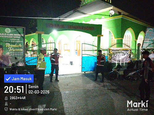 Kegiatan pengamanan di sejumlah masjid di wilayah Kota Saumlaki dan sekitarnya ini melibatkan personel gabungan dari berbagai Satuan, termasuk Satuan Lalu Lintas untuk pengaturan arus lalu lintas dan Satuan Samapta untuk patroli dialogis di area sekitar rumah ibadah, Senin (02/03/26) malam.