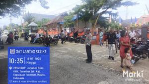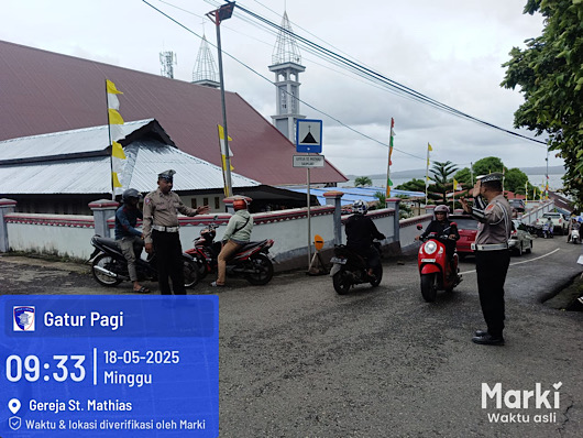 Terpantau kesibukan sejumlah personel Satuan Lalu Lintas Polres Kepulauan Tanimbar tampak mengatur jalur kendaraan saat melintas di depan sejumlah Gereja yang ada di Wilayah Kota Saumlaki, Kecamatan Tanimbar Selatan, Kabupaten Kepulauan Tanimbar pada, Minggu (18/05/25) pagi.