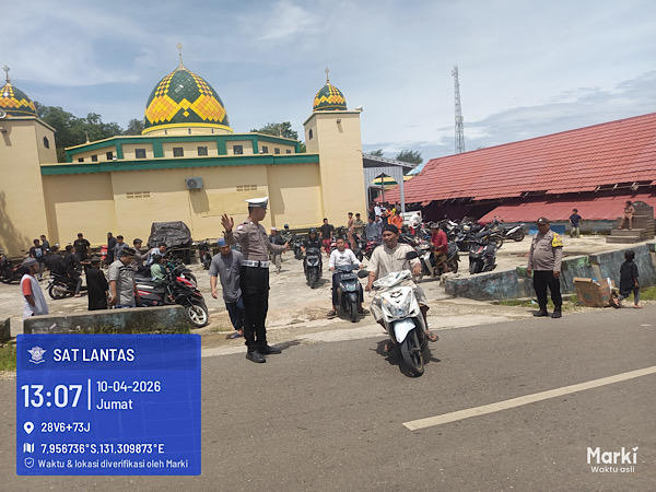 Tribratanews.polrestanimbar.com – Polda Maluku, Kepolisian Resor Kepulauan Tanimbar, Jajaran Satuan Lalu Lintas (Sat Lantas) Polres Kepulauan Tanimbar kembali menyiagakan Personel di sejumlah Masjid besar yang di Wilayah Kota Saumlaki untuk mengamankan jalannya ibadah sholat Jumat berjamaah pada, Jumat (10/04/26).