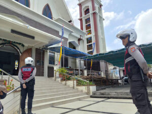 Tampak terlihat Personel Sat Samapta secara aktif memantau situasi di sekitar area Gereja dengan melakukan Patroli, berkoordinasi dengan petugas keamanan Gereja hingga lakukan pengaturan arus lalu lintas terhadap kendaraan yang masuk dan keluar Gereja maupun kendaraan yang melintas, serta membantu menyeberangkan para Umat.