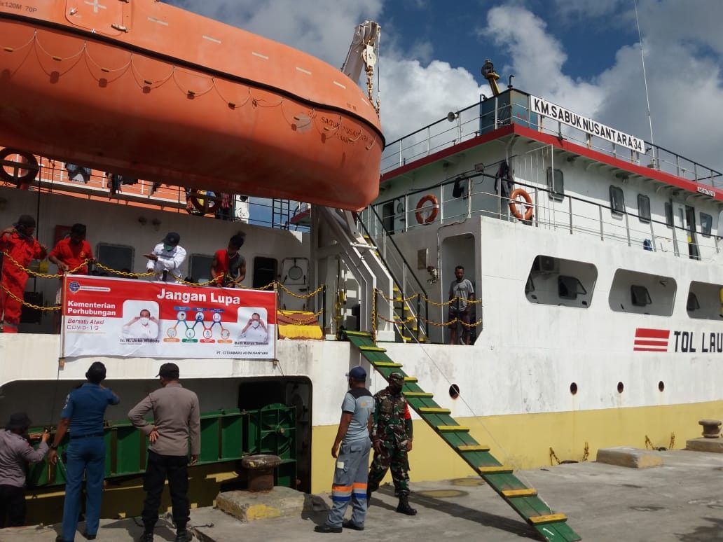 Tribratanews.polrestanimbar.com – Polda Maluku, Polres Maluku Tenggara Barat, Jumat 16 Oktober 2020, pukul 09.20 wit, bertempat di Pelabuhan Yos Sudarso Saumlaki, personil Ops Aman Nusa II Polres Kepulauan Tanimbar melaksanakan Giat Pengamanan kedatangan Pelaku Perjalanan  KM. Sabuk Nusantara 34 yang dipimpin oleh Kabag Ren Polres Kepulauan Tanimbar Kompol M. Uwaubun.