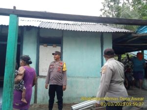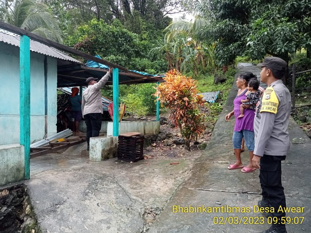 Tribratanews.polrestanimbar.com – Polda Maluku, Polres Kepulauan Tanimbar, Kanit Binmas Bripka Theo Y. Sabono bersama Bhabinkamtibmas Desa Awear Briptu A. Pattipelohy membantu Warga dan mendatakan masyarakat Desa Awear, Kec. Fordata, Kab. Kepulauan Tanimbar yg terkena dampak Angin Puting Beliung, Kamis (02/03).