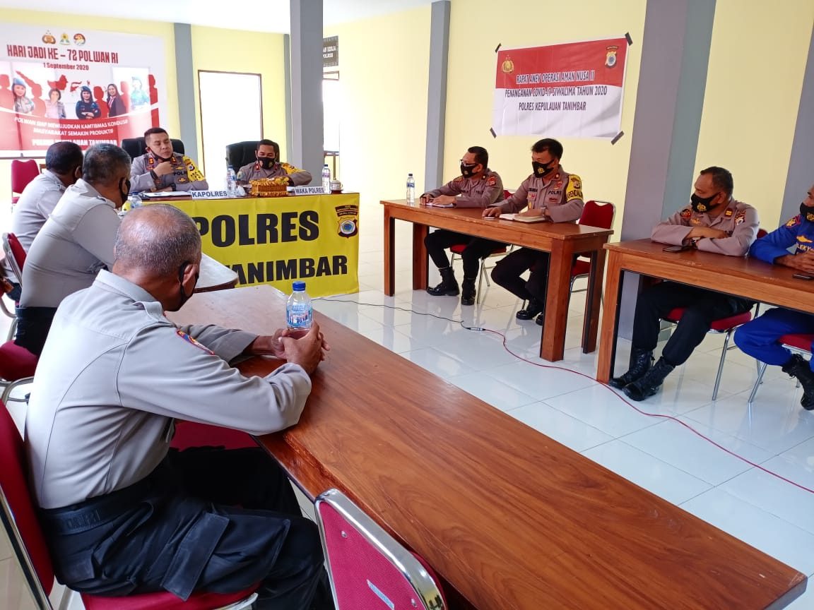 Tribratanews.polrestanimbar.com – Polda Maluku, Polres Maluku Tenggara Barat, Kamis 17 September 2020, pukul 11.50 wit bertempat di Ruangan Vicon Polres Kepulauan Tanimbar dilaksanakan Giat Anev Operasi Aman Nusa II yang di pimpin oleh Kapolres Kepulauan Tanimbar AKBP Romi Agusriansyah, S.I.K., di dampingi oleh Waka Polres Kepulauan Tanimbar Kompol Hendra Y. P. Haurissa, S.H.