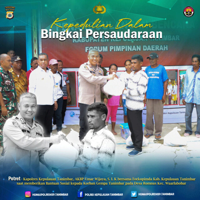 Tribratanews.polrestanimbar.com – Polda Maluku, Polres Kepulauan Tanimbar, bertempat di Desa Romnus Kecamatan Wuarlabobar, Kapolres Kepulauan Tanimbar AKBP Umar Wijaya, S.I.K kembali melakukan Penyaluran Debarkasi Bantuan Sosial Bencana Alam bersama Forkopimda KKT dan TNI – Polri kepada Korban Bencana Alam sekaligus meninjau lokasi Pulau Timbul yang berada di Desa Teineman, Kecamatan Wuarlabobar, Kabupaten Kepulauan Tanimbar, Sabtu (14/1/23).
