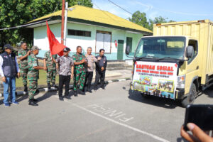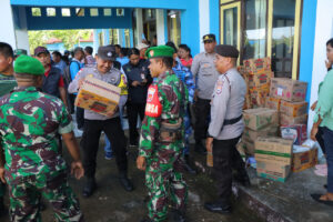 Debarkasi Bantuan Sosial oleh TNI – POLRI di Kantor Camat Wertamrian yang kemudian akan di distribusikan kepada Masyarakat yang terkena dampak bencana antara lain 576 25 Lembar, Family Kit 10 Paket, Kids Ware 576 10 Paket, Pembalut Wanita 24 Paket, Sembako 110 Paket, Obat-obatan 4 Karton, Peralatan Dapur (Kompor) 2 Paket, Sembako Kontainer : 1 Kontainer.