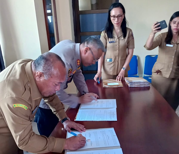 Tribratanews.polrestanimbar.com – Polda Maluku, Kepolisian Resor Kepulauan Tanimbar, Kapolres AKBP UMAR WIJAYA, S.I.K., bersama Penjabat Bupati Kepulauan Tanimbar PITERSON RANGKORATAT, S.H., serta Forkopimda melakukan penandatanganan NPHD (Naskah Perjanjian Hibah Daerah) untuk Pengamanan Pemilihan Kepala Daerah Kabupaten Kepulauan Tanimbar, Senin (05/02/24).