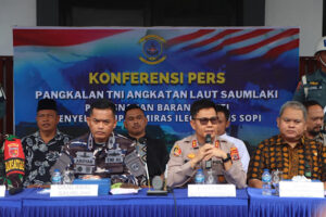 Tribratanews.polrestanimbar.com – Polda Maluku, Kepolisian Resor Kepulauan Tanimbar, Kapolres Kepulauan Tanimbar AKBP UMAR WIJAYA, S.I.K., M.H., hadiri Konferensi Pers dalam rangka pemusnahan barang bukti penyelundupan minuman keras (miras) ilegal jenis Sopi yang digelar oleh Pangkalan TNI Angkatan Laut Saumlaki, Jumat (11/04/25) pagi.