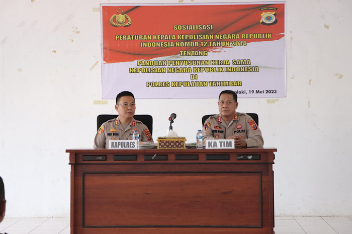Kegiatan Sosialisasi terkait Panduan Penyusunan Kerja Sama Kepolisian Negara Republik Indonesia ini dibuka langsung oleh Kapolres Kepulauan Tanimbar AKBP Umar Wijaya S.I.K., dan didampingi oleh Kabag Kerma Biroops Polda Maluku AKBP Luther Banne, S.H., M.H.