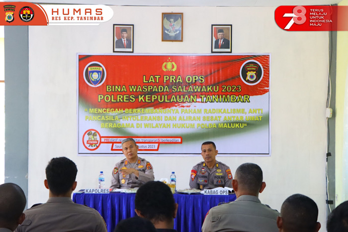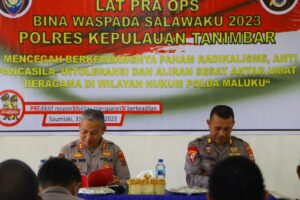 Tribratanews.polrestanimbar.com – Polda Maluku, Polres Kepulauan Tanimbar, melalui Tema “Mencegah Berkembangnya Paham Radikalisme, Anti Pancasila, dan Aliran Sesat Antar Umat Beragama” di wilayah hukum Polda Maluku, Polres Kepulauan Tanimbar menggelar Pelatihan Pra Operasi Kepolisian dengan sandi Bina Waspada Salawaku 2023, Kamis (31/08).