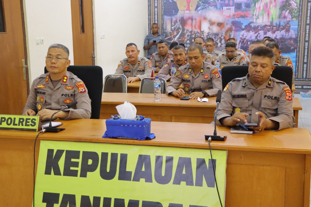 Tribratanews.polrestanimbar.com – Polda Maluku, Polres Kepulauan Tanimbar, Kapolres AKBP Umar Wijaya, S.I.K., bersama para Pejabat Utama, Perwira Staf dan Kapolsek Jajaran Ikuti kegaitan Video Conference (Vicon) Rapat Sosialisasi Program Quick Wins Presisi yang dipimpin Kadiv TIK Polri, Irjen Pol. Slamet Uliandi, S.I.K., Jumat (28/10).