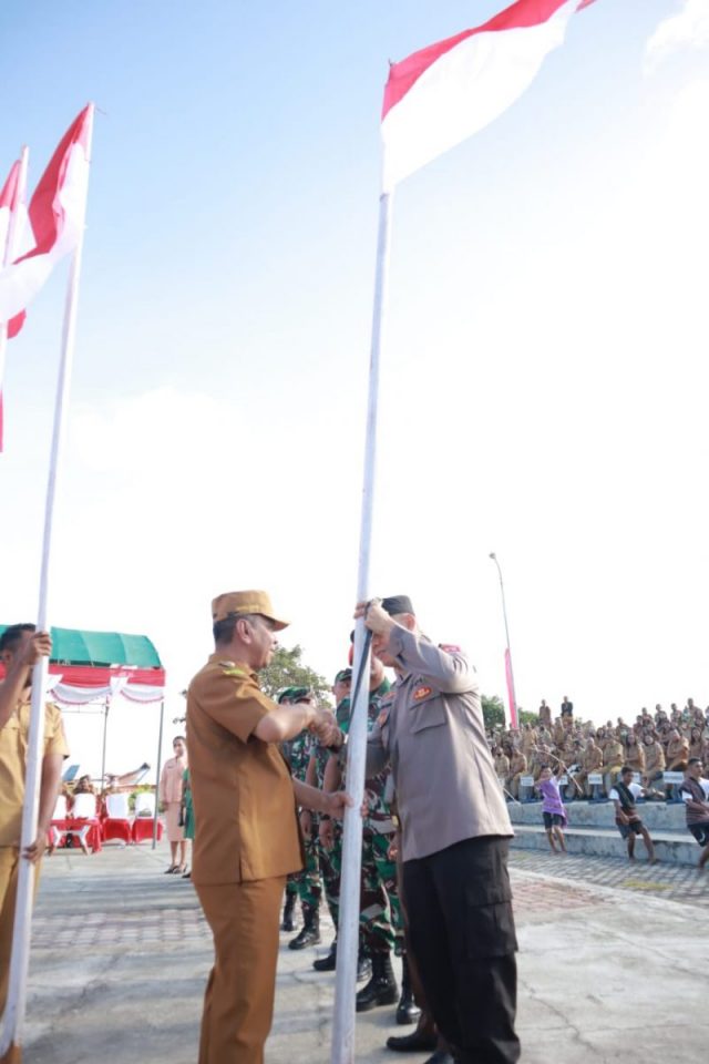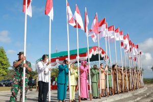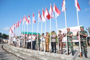 Usai Doa, Pj. Bupati kemudian menyerahkan bendera merah putih kepada forkopimda dan tamu undangan yang hadir untuk ditancapkan pada tempat yang telah disediakan.