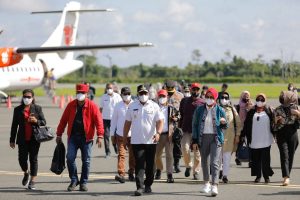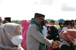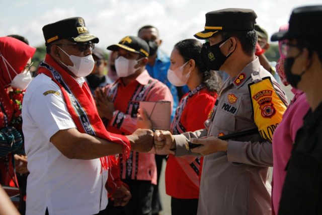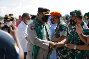 Tribratanews.polrestanimbar.com – Polda Maluku, Polres Kepulauan Tanimbar, Kapolres Tanimbar AKBP Umar Wijaya, S.I.K., didampingi ketua bhayangkari cabang kepulauan Tanimbar Ny. Anjarie Umar bersama forkopimda kabupaten kepulauan Tanimbar jemput kedatangan Gubernur Maluku Irjen Pol. (Purn) Drs. Murad Ismail dan Kabid Humas Polda Maluku Kombes Pol. Drs. Muhammad Roem Ohirat selaku yang mewakili Kapolda Maluku bersama rombongan lainnya dalam rangka menghadiri acara Pembukaan MTQ ke-29 provinsi Maluku di Tanimbar. Kamis (17/03/2022).