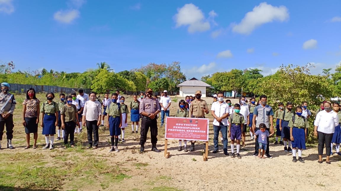 Tribratanews.polrestanimbar.com – Polda Maluku, Polres Maluku Tenggara Barat, Rabu 23 September 2020, pukul 09.30 wit s/d 10.00 wit, di laksanakan kegiatan Operasi Yustisi terhadap Pelanggar Protokol Kesehatan di SMP 1 Atap Desa Adaut Kecamatan Selaru, Kabupaten Kepulauan Tanimbar dilaksanakan giat Penerapan Protokol Kesehatan Pencegahan Covid-19 di lingkungan Sekolah di Kecamatan Selaru Kabupaten Kepulauan Tanimbar, dengan giat disiplin penggunaan Masker, Giat Mencuci tangan dan pengukuran suhu badan sebelum memasuki ruang kelas.