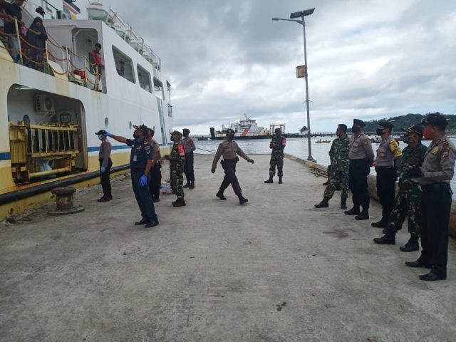 Tribratanews.polrestanimbar.com – Polda Maluku, Polres Maluku Tenggara Barat, Kamis 06 Agustus 2020, pukul 15.40 wit bertempat di Pelabuhan Larat Kecamatan Tanimbar Utara Kabupaten Kepulauan Tanimbar, Kapolsek Tanimbar Utara Iptu E. Weridity Pimpin Personil Polsek Tanimbar Utara bersinergi dengan personil TNI Koramil Larat dan Petugas Gustu Covid-19 Tanut melaksanakan Pengamanan Kedatangan KM. Sabuk Nusantara 103 dari Pelabuhan Ambon.
