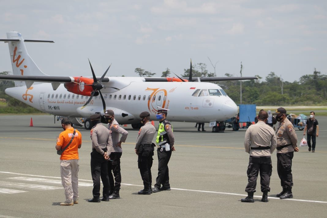 Tribratanews.polrestanimbar.com – Polda Maluku, Polres Maluku Tenggara Barat, Selasa 17 November 2020, pukul 11.00 wit, Bertempat di Bandar Udara Mathilda Batlayeri Saumlaki, Pelaku Perjalanan Pesawat Wings Air ATR/72-600 dengan nomor Penerbangan LD 1516/17NOV AMQ – SXK yang berjumlah 60 orang mendapatkan Pengamanan dari Personil Ops Aman Nusa II Polres Kepulauan Tanimbar.