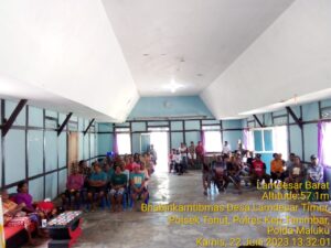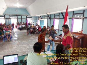 Tribratanews.polrestanimbar.com – Polda Maluku, Polres Kepuluan Tanimbar, Bhabinkamtibmas Desa Lamdesar Timur Briptu Edison S. Metaloby melakukan pengamanan dan pengawalan penyaluran Bantuan Langsung Tunai (BLT) yang bertempat di Balai Desa Koratutul Lamdesar Timur, Kecamatan Tanimbar Utara, Kabupaten Kepulauan Tanimbar, Kamis (22/06).