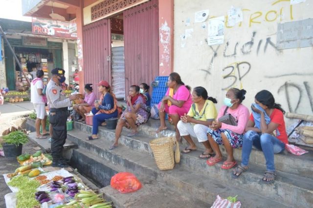 Tribratanews.polrestanimbar.com – Polda Maluku, Polres Maluku Tenggara Barat, Kbo Sat Samapta Ipda C.Warawarin beserta 6 personil Sat Samapta Polres Maluku Tenggara Barat,mendatangi warga yang sedang berjualan sambil berkerumun pada lokasi pertokoan yamdena plaza Saumlaki, Kabupaten Kepulauan Tanimbar.Kamis (23/4/2020).