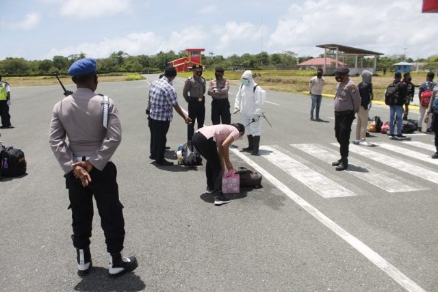 Tribratanews.polrestanimbar.com – Polda Maluku, Polres Maluku Tenggara Barat, Rabu 14 Oktober 2020, pukul 10.55 wit, bertempat di Bandara Udara Mathilda Batlayeri Saumlaki dilaksanakan kegiatan Pengamanan sekaligus Penjemputan oleh personil Aman Nusa II Polres Kep. Tanimbar terhadap Pelaku Perjalanan dari Wilayah Kota Ambon Provinsi Maluku dengan menggunakan Pesawat Wings Air dengan nomor Penerbangan LD 1516/14 OCTAMQ – AMQ SXK.