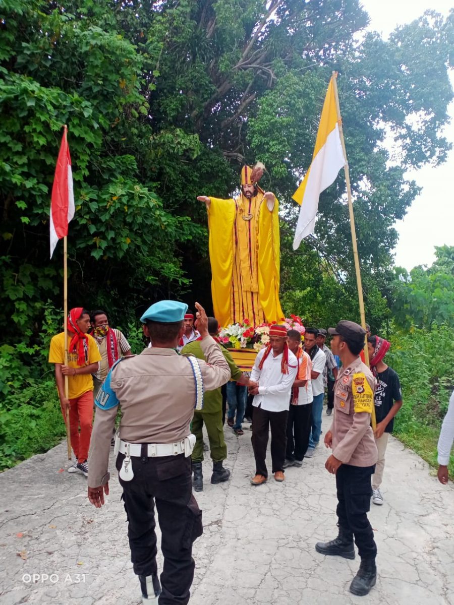 Tribratanews.polrestanimbar.com – Polda Maluku, Polres Kepulauan Tanimbar, Polsek Fordata lakukan Pengamanan kegiatan Keagamaan Perarakan Arca Kristus Raja Semesta Alam di Desa Awear, Kecamatan Fordata, Rabu (16/11).