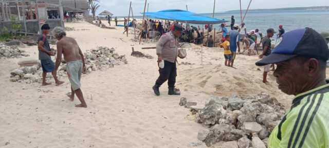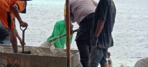 Nampak Bhabinkamtibmas yang menggunakan baju dinasnya ikut berbaur mencampur bahan material yang akan digunakan untuk mengecor pondasi bangunan Talit penahan Pantai. Meskipun mengunakan pakaian dinas, bukan penghalang bagi Bripka Theo. Y. W. Sambonu untuk ikut kerja bakti membantu warga yang sedang bergotong royong.
