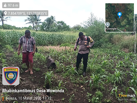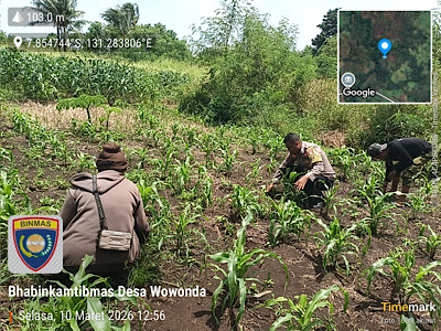 Tribratanews.polrestanimbar.com – Polda Maluku, Kepolisian Resor Kepulauan Tanimbar, Dalam rangka menyukseskan program Ketahanan Pangan Nasional, Bhabinkamtibmas Desa Wowonda, Bripka ALAN TALAHATU melakukan aksi nyata dengan mendampingi Petani lokal dalam perawatan tanaman jagung hibrida di kawasan Kebun Trans pada, Selasa (10/03/26).
