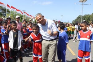 Nampak terlihat Kapolres Kepulauan Tanimbar membagikan Hadiah bagi Pemenang Lomba Gawang Mini pada Acara Car Free Day tersebut.