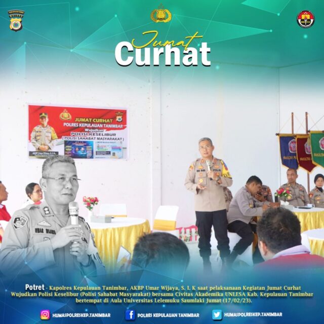 Kapolres Kepulauan Tanimbar AKBP Umar Wijaya, S.I.K pimpin kegiatan Jumat Curhat yang didampingi oleh Kabag SDM Polres Kepulauan Tanimbar AKP Mustafa Kamal, S.Sos, beserta Kasat dan Kasi Polres Kepulauan Tanimbar bersama Civitas Akademika UNLESA yang bertempat di Aula Universitas Lelemuku Saumlaki Kabupaten Kepulauan Tanimbar.