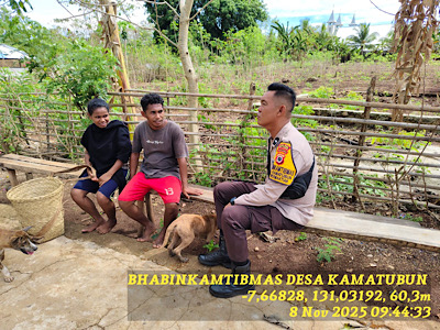 Tribratanews.polrestanimbar.com – Polda Maluku, Kepolisian Resor Kepulauan Tanimbar, Dalam mendukung program prioritas pemerintah terkait ketahanan pangan nasional sekaligus menjaga situasi kamtibmas yang kondusif, Bhabinkamtibmas Desa Kamatubun Aipda BRURY RIANTO RANGKORATAT sambangi Warga Petani, Sabtu (08/11/25).