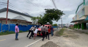 Tim Patroli KRYD Polres Kepulauan Tanimbar bantu dorong mobil angkutan yang...