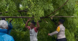 Pohon tumbang di jalan Trans Larat, Bhabinkamtibmas Keliobar sigap lakukan evakuasi...