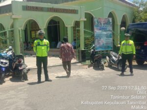 Tribratanews.polrestanimbar.com – Polda Maluku, Polres Kepulauan Tanimbar, Agar terciptanya keamanan dan kenyamanan bagi masyarakat yang hendak Melaksanakan beribadah Sholat jumat, Sat Lantas melaksanakan pengamanan dan pengaturan saat Sholat Jumat, Jumat (22/09).