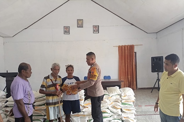 Tribratanews.polrestanimbar.com – Polda Maluku, Kepolisian Resor Kepulauan Tanimbar, Bhabinkamtibmas Desa Wermatang, Bripka F. MOUW melaksanakan pengamanan dan pemantauan langsung Serah Terima (BATS) Kolektif Bantuan Pangan berupa Beras dan Minyak Goreng Tahun Anggaran 2025, di Balai Desa Wermatang, Kecamatan Wermaktian, Kabupaten Kepulauan Tanimbar.