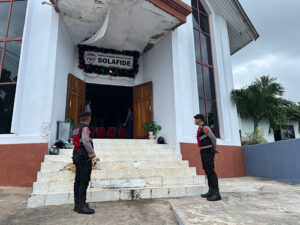 Tribratanews.polrestanimbar.com – Polda Maluku, Kepolisian Resor Kepulauan Tanimbar, Sebagai salah satu bentuk nyata kehadiran Polri dalam upaya memberikan rasa aman, nyaman, dan terlindungi saat Misa dan ibadah Minggu berlangsung, Sat Samapta Polres Kepulauan Tanimbar lakukan pengamanan dan patroli di sejumlah Gereja, Minggu (01/06/25).
