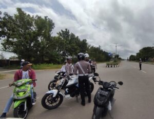 Terlihat para Personel gabungan yang dilibatkan tersebut memberhentikan Pengendara Pelanggaran yang terlihat secara kasat Mata tidak menggunakan Helm standar SNI serta tidak memiliki Pelat Nomor Polisi pada Kendaraan