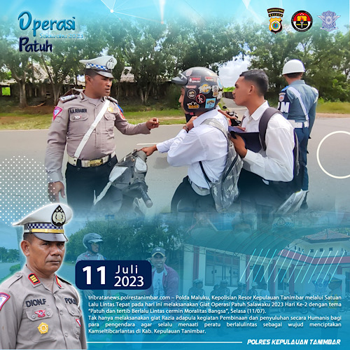 Tribratanews.polrestanimbar.com – Polda Maluku, Kepolisian Resor Kepulauan Tanimbar melalui Satuan Lalu Lintas melaksanakan Operasi Patuh Salawaku 2023 di Hari Kedua secara Patroli Hunting pada seputaran Jl. Ir. Soekarno Saumlaki, Kecamatan Tanimbar Selatan, Kabupaten Kepulauan Tanimbar, Selasa (11/07).