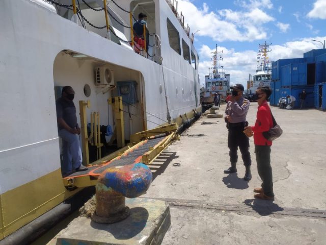 Tribratanews.polrestanimbar.com – Polda Maluku, Polres Maluku Tenggara Barat, Kamis 20 Agustus 2020, pukul 11.50 wit, bertempat di lokasi areal Pelabuhan Laut Saumlaki, Kabupaten Kepulauan Tanimbar, personil Operasi Aman Nusa II Polres Kepulauan Tanimbar melaksanakan Pengamanan Kedatangan Para Pelaku Perjalanan dari Wilayah Provinsi Maluku Kota Ambon sebanyak 6 orang dengan menggunakan KM. Sabuk Nusantara 104. Kedatangan Para Pelaku Perjalanan seluruhnya diterapkan Protokol Kesehatan Pencegahan Covid-19 dari Tim Gugus Tugas Covid-19 Kabupaten Kepulauan Tanimbar. Seluruh penumpang yang berjumlah 6 orang semuanya melalui Protokol Kesehatan Pencegahan Covid-19 di Pelabuhan Saumlaki dan yang lainnya melaksanakan Protokol Kesehatan dalam pencegahan Covid-19 dengan rata – rata pemeriksaan suhu tubuh berkisar antara 36,3°C s/d 36,5°C.